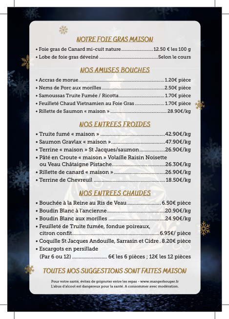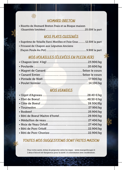Notre équipe de bouchers, charcutiers et traiteurs a imaginé pour vous une farandole de suggestions festives : entrées chaudes ou froides, amuses-bouches, foie gras, farces, accompagnements, sauces, plats cuisinés… Sans oublier nos volailles et viandes sélectionnées avec soin, issues de notre circuit court et de notre savoir-faire artisanal.